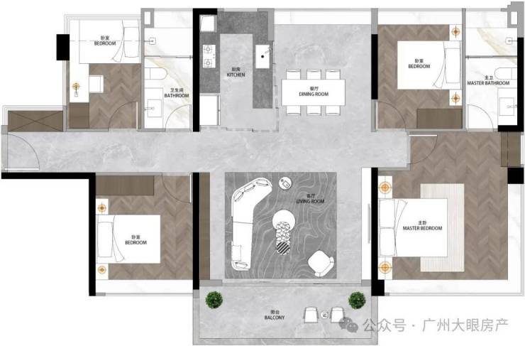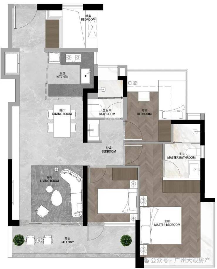 约6.6m宽景阳台,全屋空间通透感强,超22㎡主卧套间,奢阔私享空间
