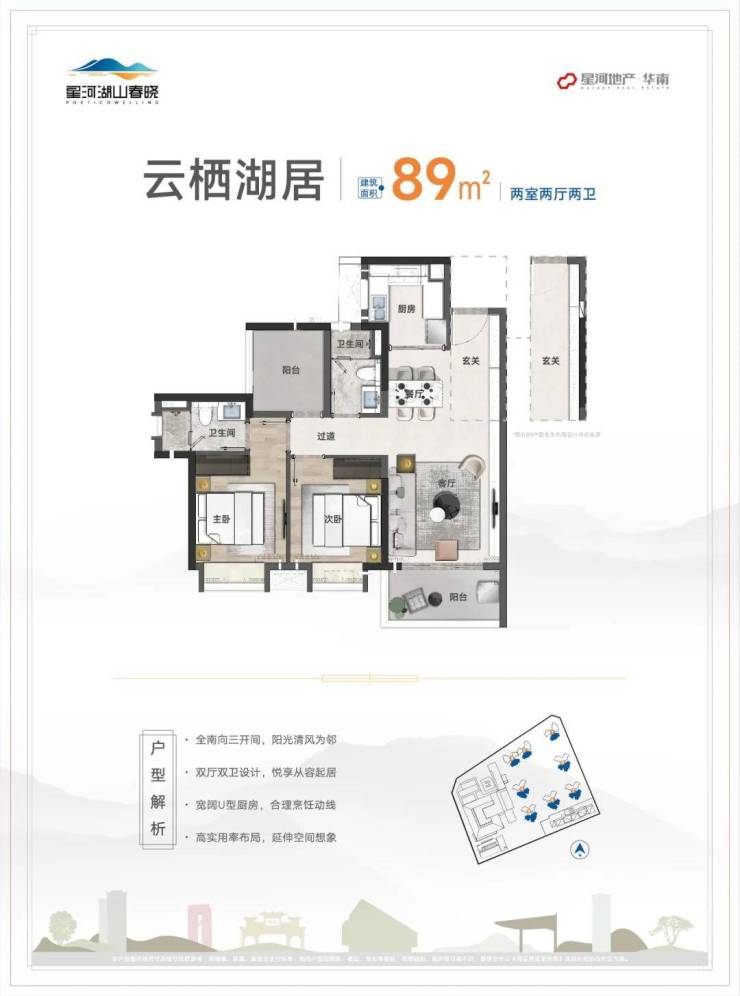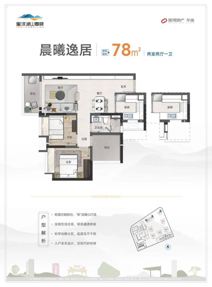 星河湖山春晓花园建面约78㎡的2+1房,精致紧凑户型,LDKG一体化开放空间,餐客厨相连,横厅设计,延伸空间舒适度。创意空间设计,书房、儿童房、健身房等多功能随心切换。