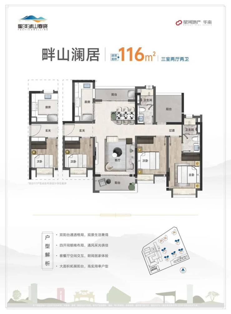 而建面约116㎡3+1房户型,大面积拓展阳台+观景阳台,拥享瞰山揽湖的IMAX观景视野,自在畅享宽境人生。南向四开间布局,每一个家人都能享受冬暖夏凉的起居空间。