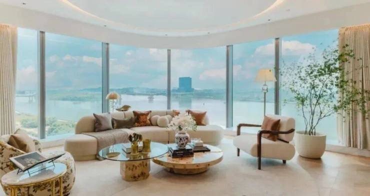 • 细节较真到离谱:弧形墙面不用拼接工艺,直接整块意大利洞石切割;实木地板要进实验室做7天7夜温湿循环测试,就为了适应江畔环境;电视背景墙用普拉达绿奢石,卫生间铺香格里拉翡翠、米兰红奢石,嘉格纳电器、德国雅生龙头、土耳其巴斯蒂姆五金,全是行业顶尖品牌;