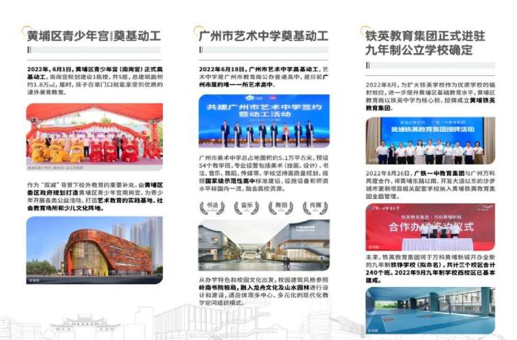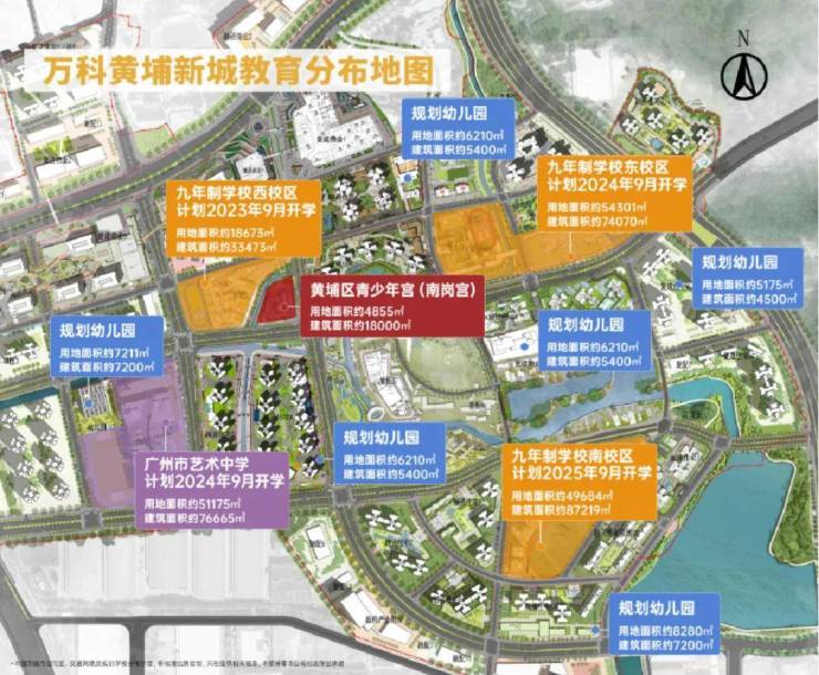 黄埔新城整体项目规划了6所幼儿园、1所九年制铁铮学校分为三个校区、1所艺术中学(高中)以及一个课外的少年宫,横跨16年的一站式全龄教育,中小学总规划240班(小学168班,中学72班)。