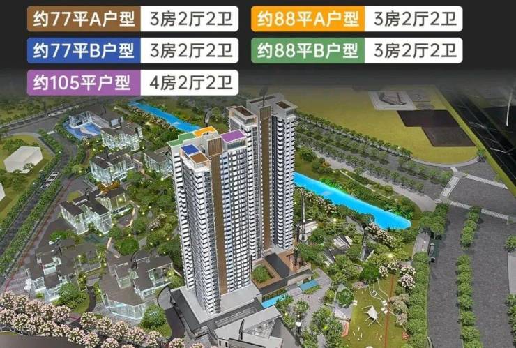 项目首开1、9栋,33层高,2T5,总套数约320套。产品以刚需面积为主,77平小户型做到东南朝向,预计27年年底交楼,