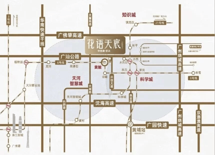 地铁——临近广州地铁6号线的黄陂站、金峰站,1站到天河高塘石,6站到天河客运站,直达达珠江新城 CBD;周边还有广州地铁21号线和黄埔有轨电车,串联多条地铁;