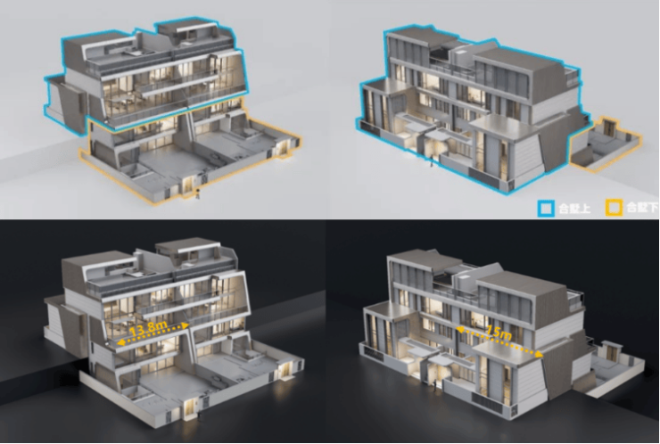 合墅(下)主要空间设置在二层及三层,合墅(上)主要空间设置在三层及四层,互相空间独立,系统完整。