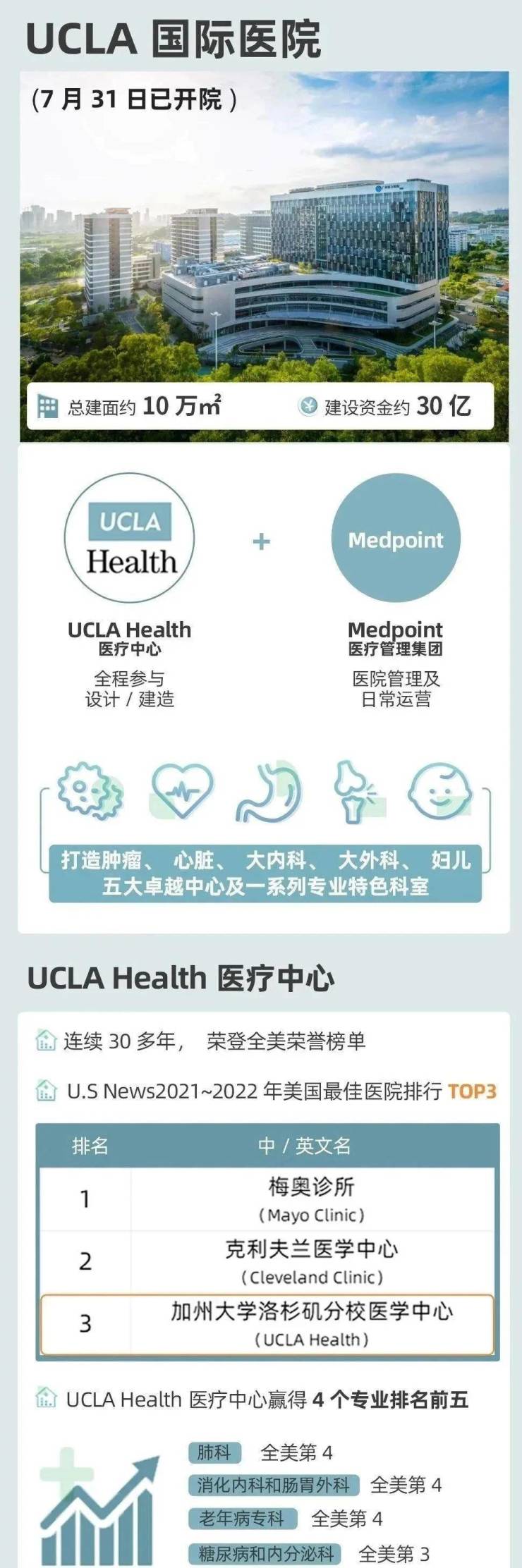 UCLA国际医院(在建):全美前三医疗中心在华首家附属医院,提供国际诊疗服务。