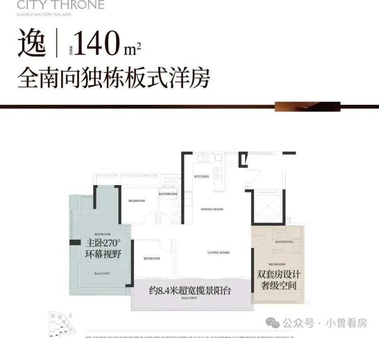 约8.4米南向巨幕阳台,主卧270°飘窗,能最大程度引园景入室。