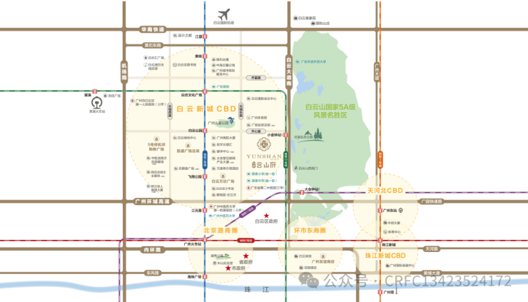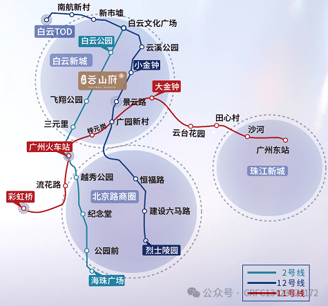 项目旁共有三条地铁线,目前有已开通的嘉禾望岗——广州南站的2号线,距离飞翔公园站(约1KM)、白云公园站(1.2KM),可以连接广州火车站、北京路商圈等。其中,项目距离最近项目的12号线,设有小金钟站,距离仅约400米。实现城市新枢纽棠溪火车站至广州学府集中区广州大学城的无缝链接,此外,列车采用的无人驾驶的6节A型车编组,将成为白云新城CBD的标志。