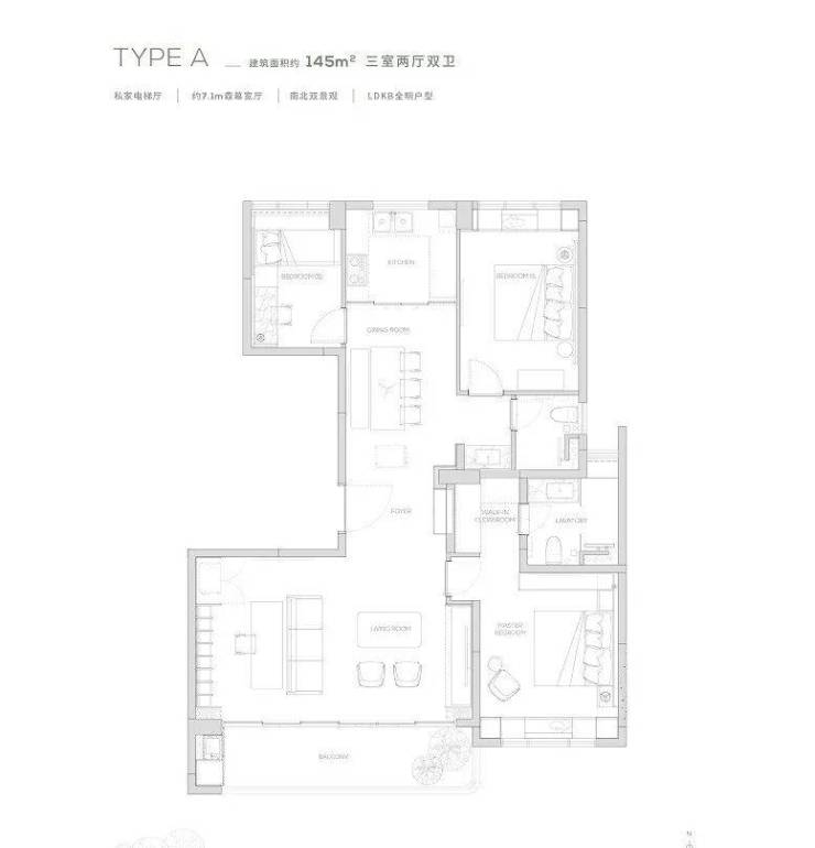 145产品为三房两厅两卫产品,餐厨一体化设计, 7米宽厅可切换各种生活场景,畅享宽幕般景观界面。