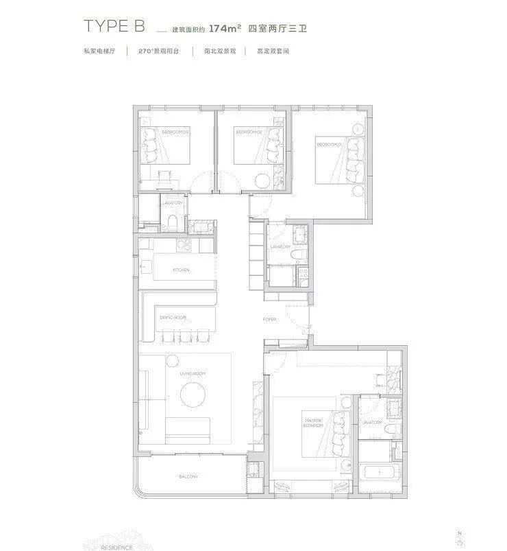 174产品为四房两厅三卫产品,打造了端户边厅布局,形成LDK一体化。无界的室内空间畅游体验,在平淡的日常里体验着生活的华章。
