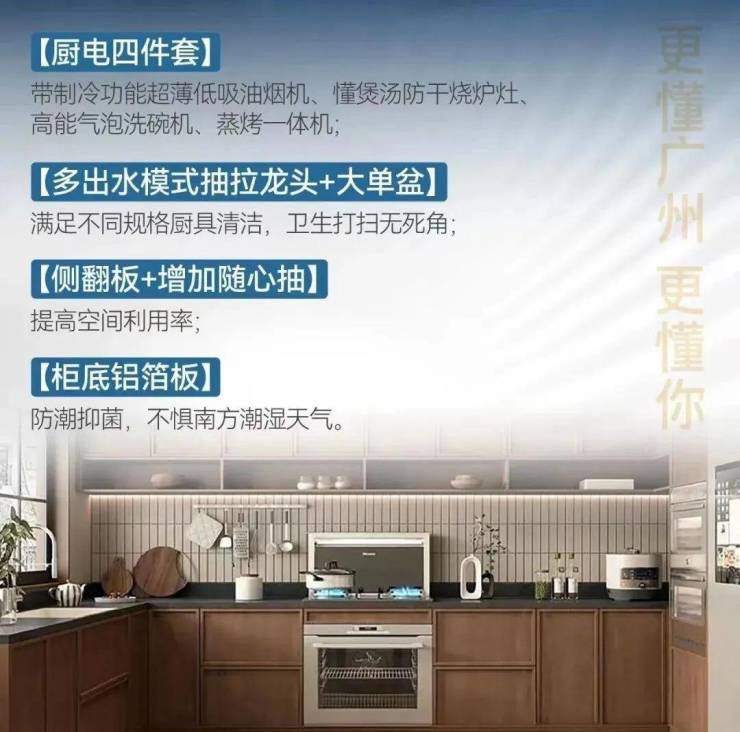 项目在交标备餐方面,设创新广式厨房其一,优化厨房空间功能不但优化了“洗-切-炒”高效厨房动线,同时实现了岛台高低台设计,集防坠落、双面收纳、定制薄柜等多元功能于一体;其二,实现广式交付标准如厨电四件套、多出水模式抽拉龙头、大单盆等,有效应对油烟、清洁等各种厨房难题。