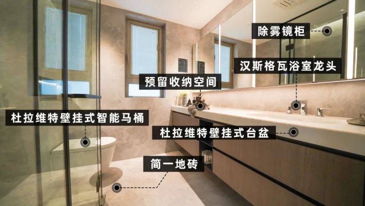 卫浴空间使用德国高端品牌汉斯格雅的浴室龙头,杜拉维特壁挂式智能马桶以及台盆。