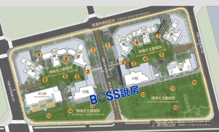 社区配 6 班幼儿园 + 2 班托儿所,主出入口设底商,代建南向公园,内部便利度尚可。