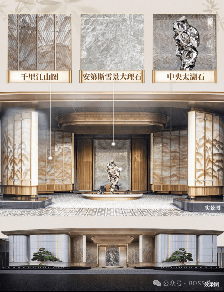 最近项目已经开放实景,项目有 60 米长、挑高 11 米的 "海珠西门王",采用雅博白大理石打造墙面,门头基座为巴西安第斯雪景大理石,门楼两侧的柱头采用宋汝窑青瓷装饰,还配置了凤鸟冠顶、飞檐翘角等设计,同时借助参数化技术将《千里江山图》铸就成流动金属画卷,彰显文化品味。