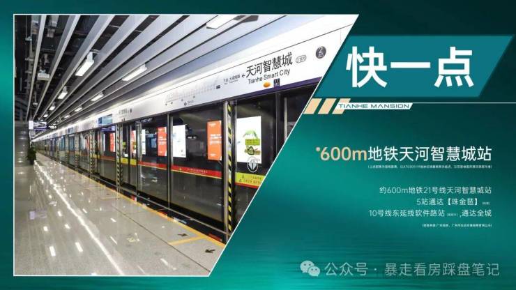 距21号线天河智慧城站约600米,步行8分钟;快线3站金融城、5站珠江新城,通勤效率拉满