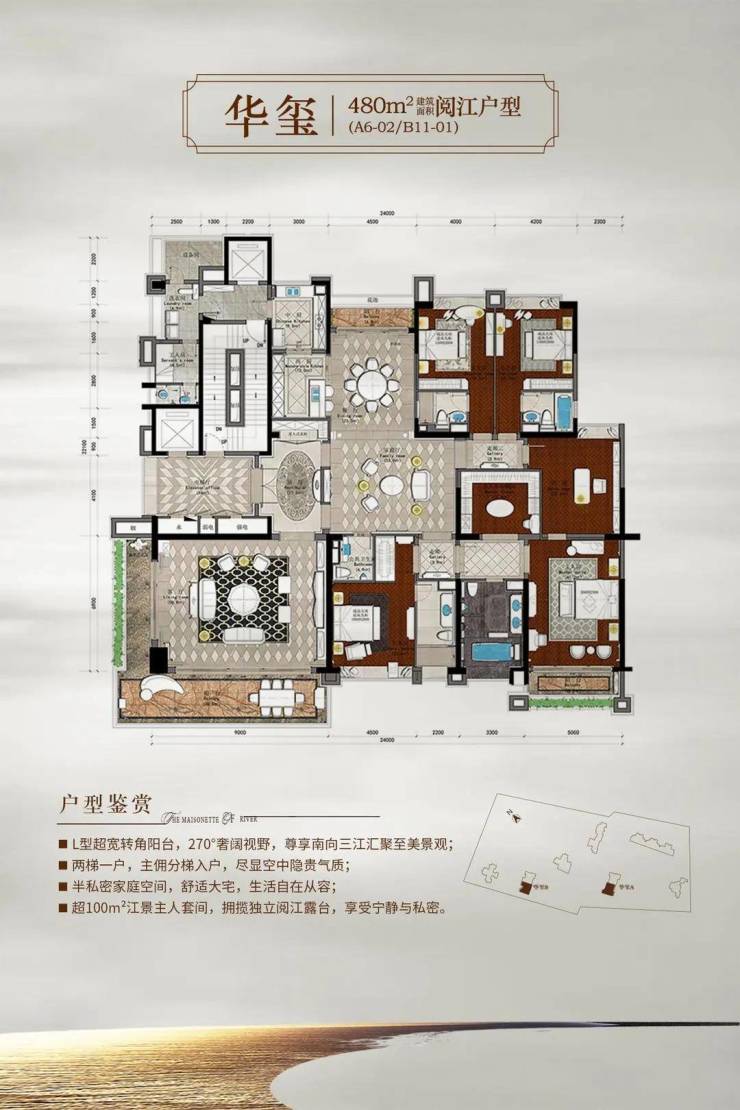 楼王华玺:A6栋1栋约32层高的版式高层洋房。四梯两户,户型面积约478㎡的超奢华五房户型。与B11同为楼王单位,户户南北通风对流,采光景观极佳,一线无敌江景;每户均特设私家入户花园,超大开间,超大阳台。