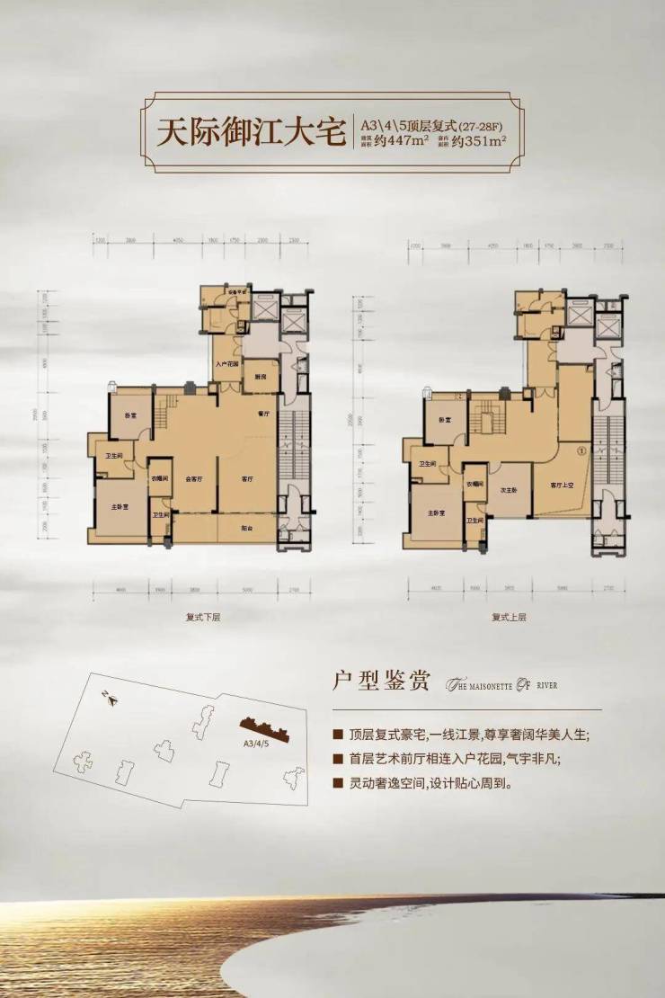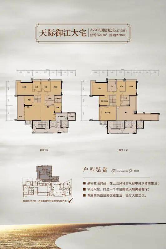 天墅产品:约28层-35层高,户型面积约360-950㎡的奢华四到五房户型;每户均特设私家入户花园,超大开间,超大阳台,无敌景观;