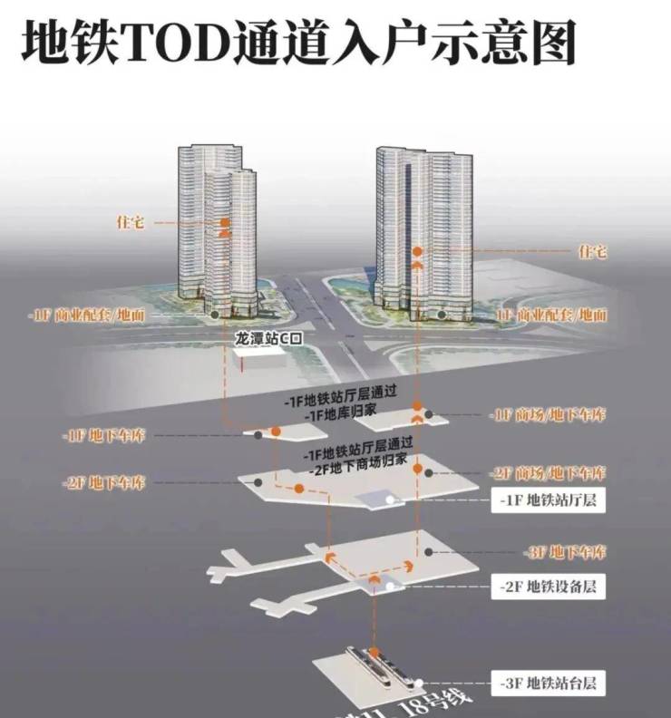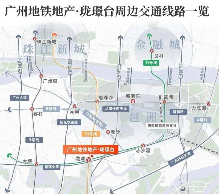 ✔️ 交通枢纽地位突出,双地铁上盖:项目最大亮点是真正的双地铁上盖(距龙潭站B出口约132米)。18号线为高速地铁,1站可达琶洲,2站直达珠江新城;11号线(在建)为广州首条环线,开通后将极大提升通往中心各区的便利性。此外,周边有“四纵三横”主干道网络,自驾出行也十分便捷。