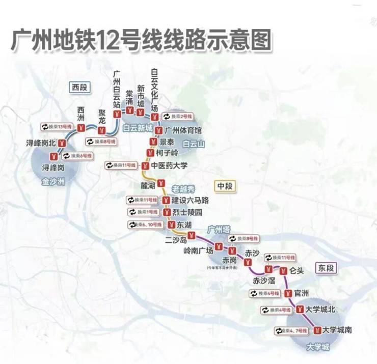 12号线(2025年6月29号已经开通)-广州换乘之王,广州市第一条无人驾驶地铁线路,与十数条轨道线无缝换乘,共经过白云文化广场、烈士陵园、二沙岛、赤沙等17个换乘站,可直达大学城,连通白云、越秀、海珠、番禺四大区域。