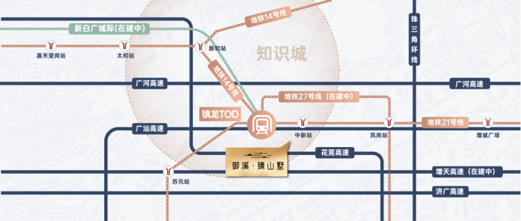 项目距地铁21号线中新站仅约500米,通过家门口的21号线,便可实现1站镇龙TOD、4站天河。而镇龙TOD,又可进一步握手“3地铁+1城轨+5高速”的超级路网,通过14号线可快速畅连黄埔、白云核芯区;