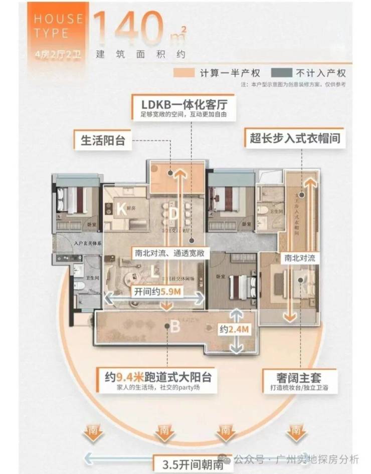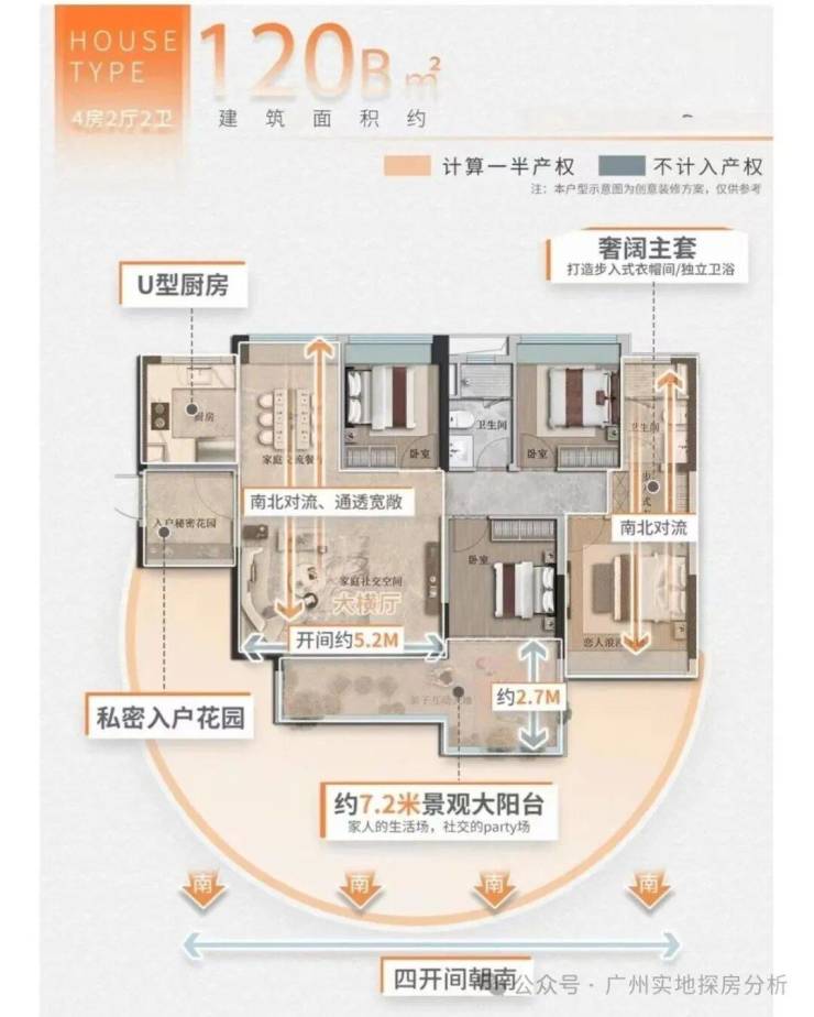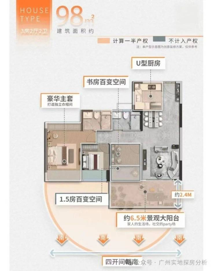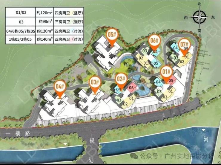 项目一共7栋住宅,19层高,2梯5户,主打的是建面约98㎡至140㎡的三至四房户型,低密度的小高层点式布局设计,使得户户朝南,户户有景。