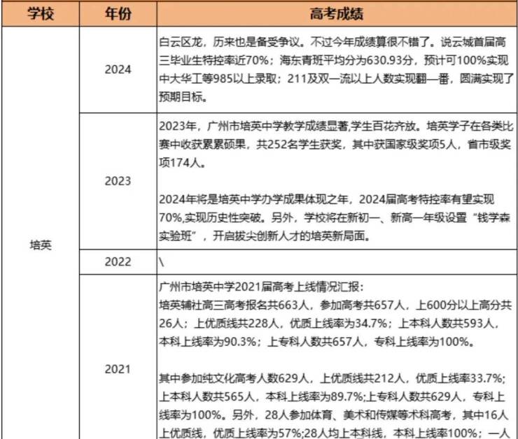 广州培英教育集团:是首批广东省一级学校,培英中学连续四年本科上线率超过90%,全白云区第一。