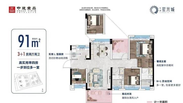 建面约91㎡丨南北通透四房