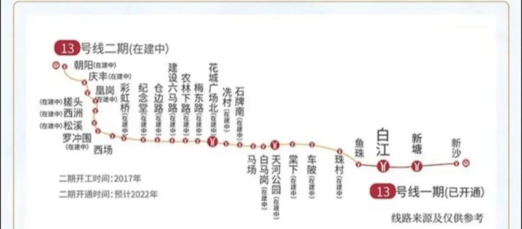 项目距离地铁13号线白江站地铁约500米、距离TOD交通枢纽中心约800米,从白江站出发,地铁2站可达黄埔,8站天河。