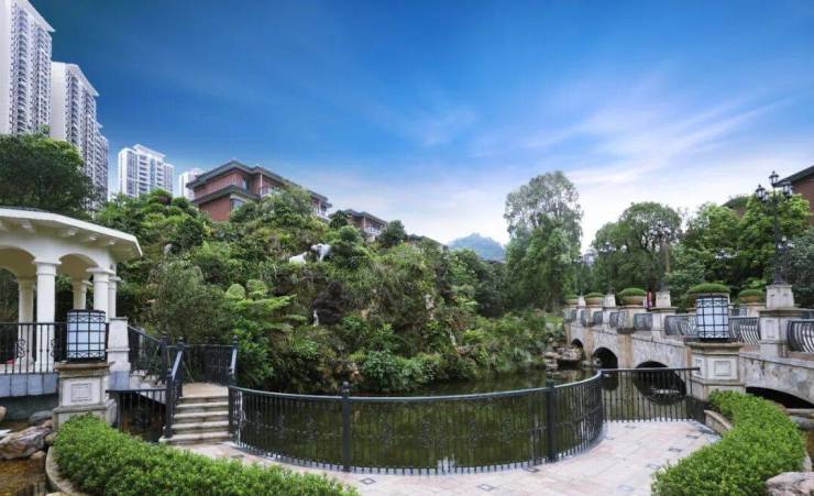 重金工法造园,采用黄蜡石打造园林水景,错落有致,移步换景。甄选全冠移植香樟树、约300年十八学士白茶花、非洲加拿列海枣树和多种季节性水果树,点缀四时山色,尽享四季盛景。