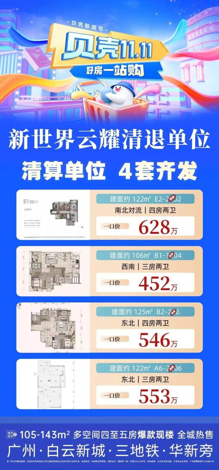 作为岭南新世界第六期的产品“新世界云耀”,由四栋高层住宅组成,面积105㎡四房和122㎡、143㎡的五房三个户型。目前项目已经处于最后的清盘阶段,全部都是现楼出售,单位都是1栋、2栋、3栋、4栋的尾货单位,近期清盘优惠特价,最近成交价基本破底价,优惠力度大,目前全盘已经全部售罄,少量二手的笋盘出售。详细的单位情况和价格优惠,可以私信详细了解。