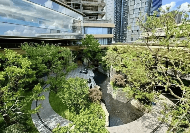 华樾小区园林秉承“外得江湖、内得山水”的造景理念,将传统园林的空间手法转移到园区内部,形成营山置水、建廊种树、以小见大、造廊架桥、堆山引水的前庭后园,再依托层层退台的建筑形态打造山水园林景观。