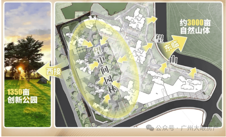 项目东临约3000亩自然山体,西瞰约1350亩创新公园,双山环绕,如同天然隔音屏障,更将带来约20倍珠江公园的负氧离子。