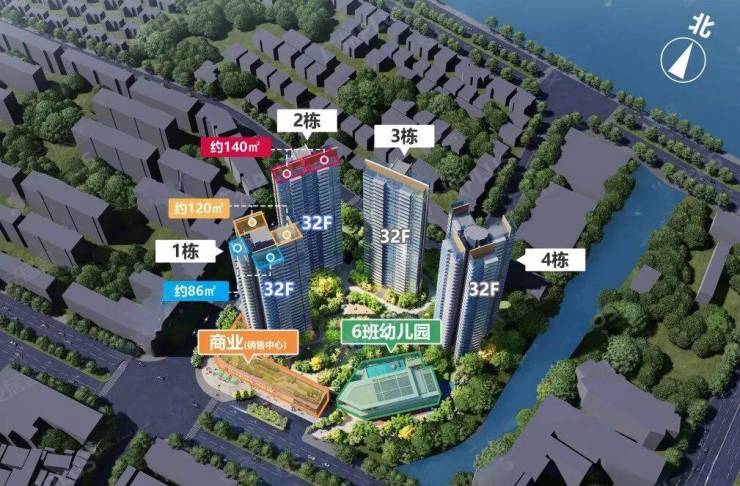 项目占地1.89万㎡,建筑面积4.78万㎡,由四栋住宅楼、一所幼儿园及底层商业组成,总户数366户,提供86-140㎡的三至四房户型,满足不同家庭的居住需求。