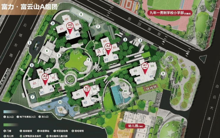 富云山自建7所学校,且配套都在兑现中。目前九年一贯制学校小学部已开学,与A组团仅一路之隔。另外,A区幼儿园已落成、九年一贯制学校(中学部)已全面封顶,加速大城教育兑现进度。