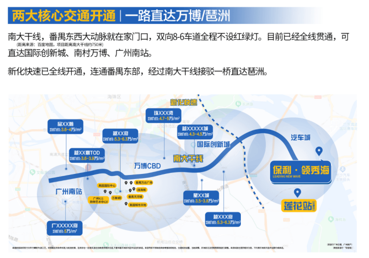 项目距离南大干线750米,双向8车道的快速路,接驳新化快速,半个小时内能到达大学城,万博,琶洲,珠江新城等核心区域,自驾开车还是可以的。
