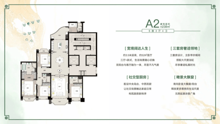 238㎡五房总价约714万起,豪装交付标准,五房三厅四卫的格局适合多代同堂,270°观景面能兼顾山景与园景,独立家政间和步入式衣帽间提升实用性。