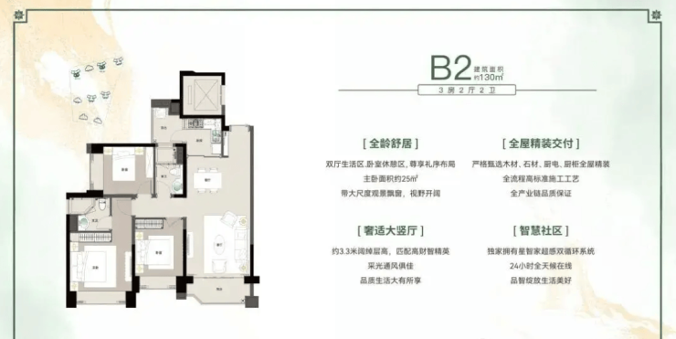 130㎡三房是刚需友好型,总价468万起,部分工抵房单价低至2.6万/㎡,3.3米层高让空间更舒展,户型方正动静分离,南向阳台能眺望山景,适合年轻家庭。