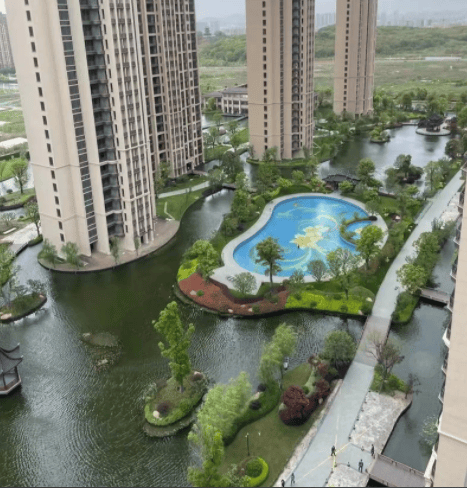 生态环境让人舒适,三面环山且紧邻80万㎡香雪公园,社区内打造了“三重水系”中式园林,亭台廊桥搭配四季绿植,还有全龄活动区、健身步道,35%的绿化率加上100米左右的楼栋间距,居住起来通透不拥挤。