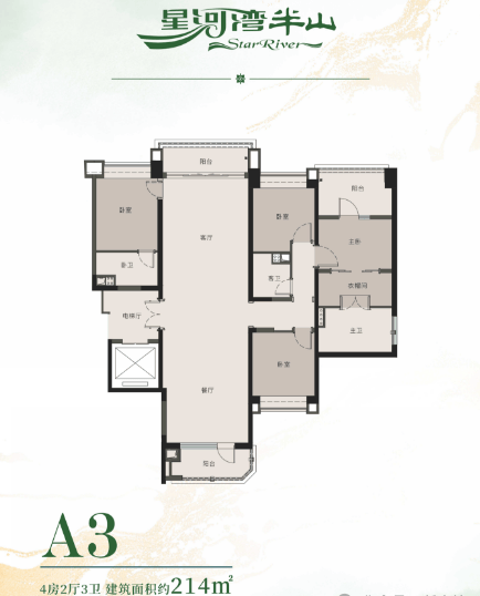 214㎡五房亮点突出,层高3.4米,南北通透的板式布局,专梯入户提升私密性,大面积客餐厅连接宽景阳台