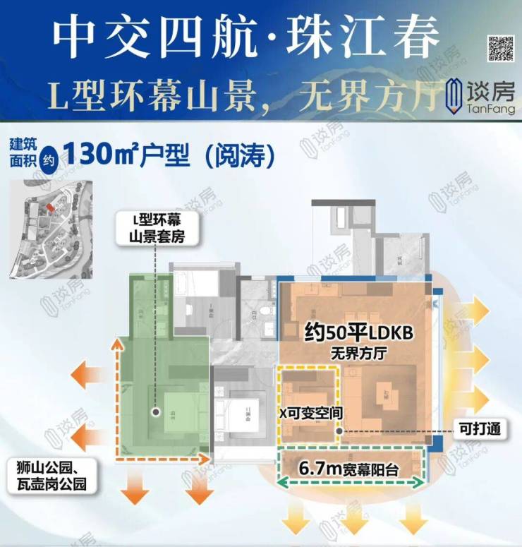 约50㎡LDKB无界方厅,直通约6.7m双面宽阳台,可隔出多一空间。