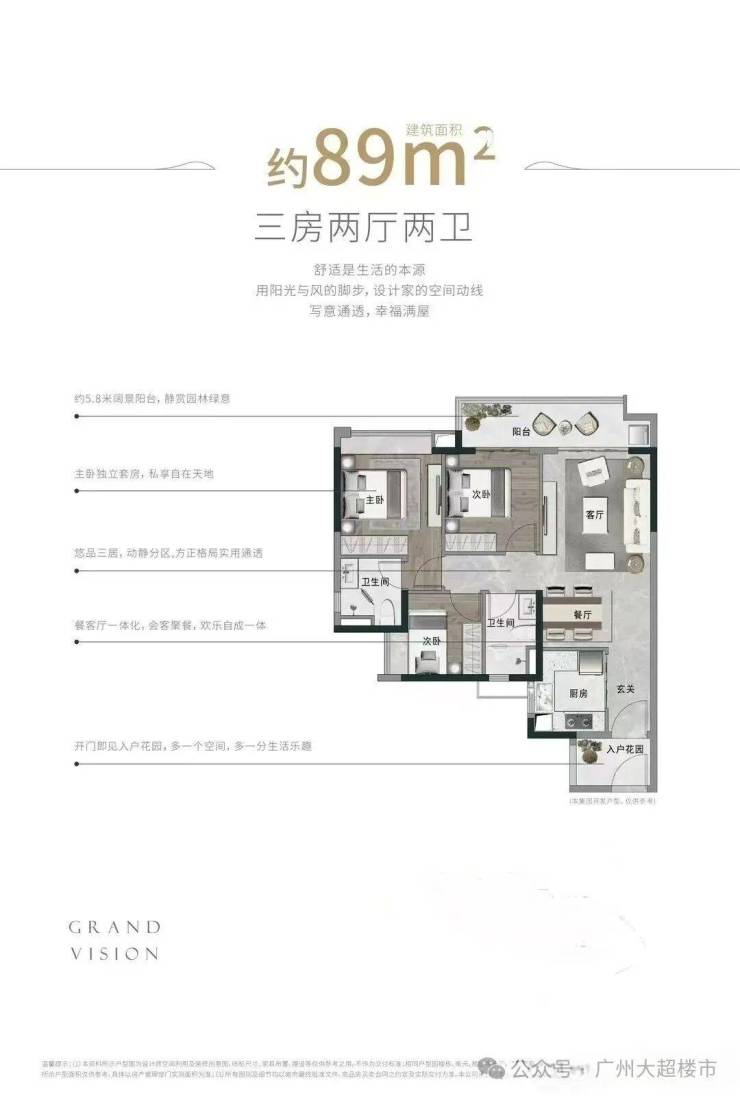 金牌上车三房 89㎡三房两厅两卫,约5.8米阔景阳台,观景、家政各有分区,主卧独立套房,私享自在天地,餐客厅一体,聚乐家厅欢乐满满。