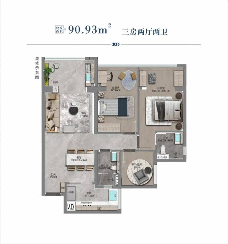 90.93㎡ 2+1房两厅两卫