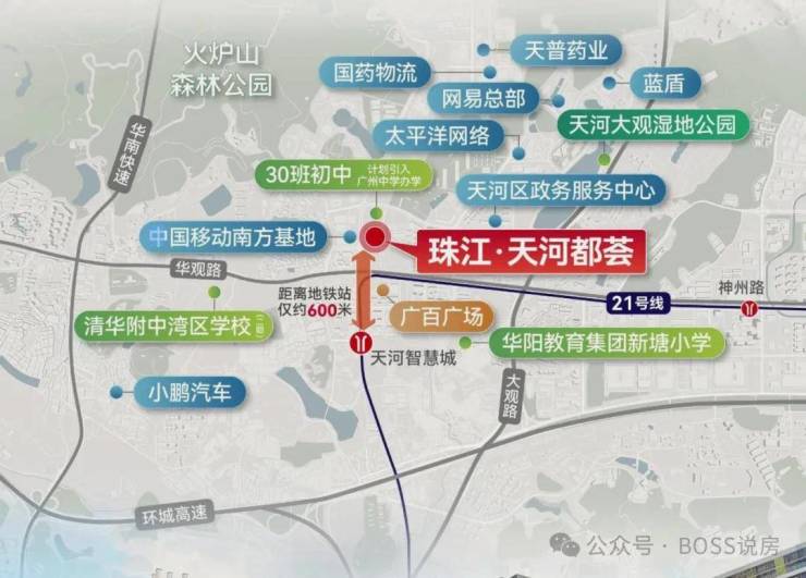 地铁:距离地铁 21 号线天河智慧城站仅约 600 米,通过快线 3 站可到达金融城,5 站直达珠江新城,还可便捷换乘地铁 11 号线、13 号线二期(在建中)。