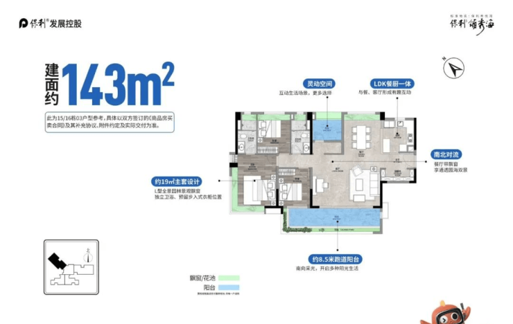 南北对流,约8.5米长阳台,西南西望园林,北向看海,主卧270度全景飘窗。