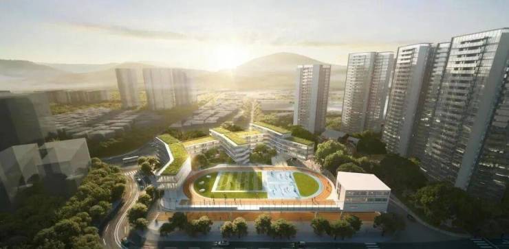 高大的教学楼、宽敞的体育场,且抬高的运动场底部,设置下沉式篮球场、兴趣大道、游泳馆、科技馆、艺术厅等场馆。