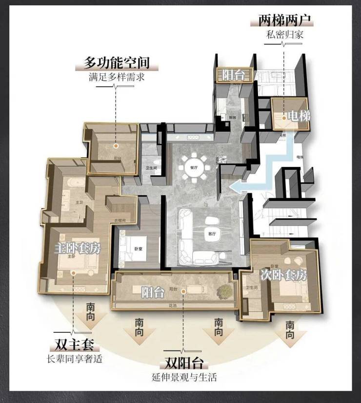 约220㎡大平层,户户四开间朝南,户户南北对流大方厅,户户两梯两户专属归家,户户双主套双阳台……