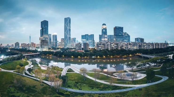 由珠江、黄埔涌、赤沙涌提供的丰富水岸景观、滨水商业及居住界面,共同编织城市绿地系统,重塑琶洲重要的滨水公共空间体系。
