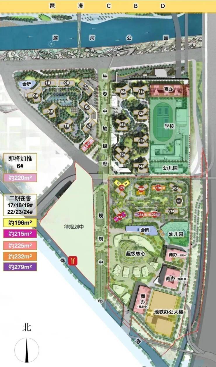 同步以琶洲南TOD、华樾为支点,沿岸打造国际滨河公园、3个高端会所、商业组团等多维城市配套。