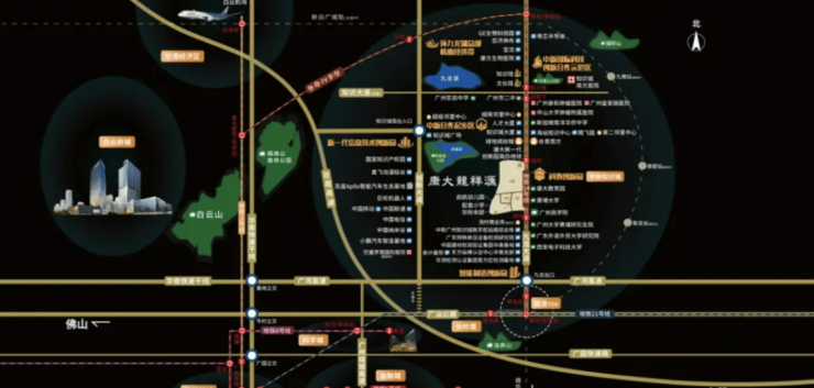 同时,项目位于中新知识城南起步区门户,紧邻广河高速九龙出口,经广河高速接驳华南快线干线,高速30分钟直达珠江新城,9分钟直达白云机场,45分钟到达湾区各大城市。