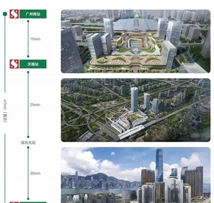 广深港高铁上汇聚新鸿三大TOD地标巨作(南站ICC-庆盛枢纽TOD-西九龙高铁站上盖发展项目),一轨之上港穗互联,比肩世界,实现双核驱动赋能发展。