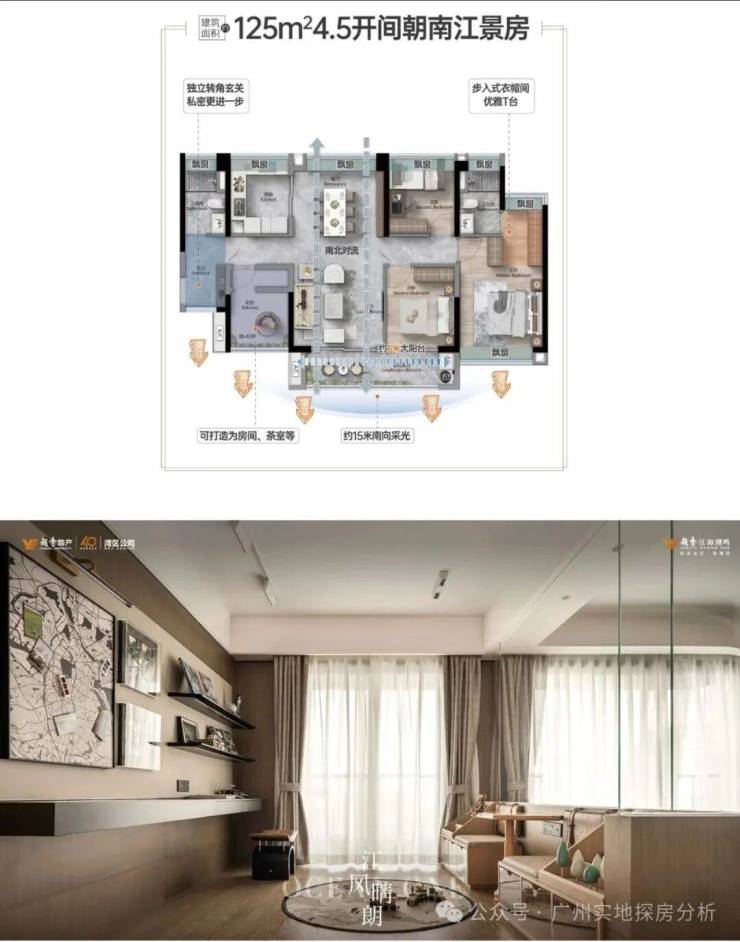 建面约125㎡王牌户型:4.5开间朝南+15米采光面,主次卧双南向。